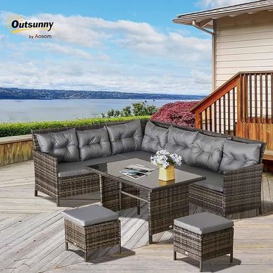 6 pieces of outdoor sectional furniture, including 3 corner sofas, 1 table, and 2 ottomans, excellent for outdoor poolside or backyard