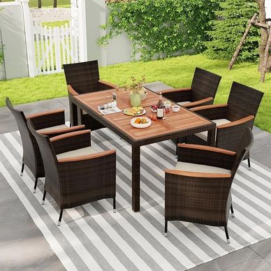 Crafted with fade-resistant acacia wood, modern mix brown PE rattan and premium steel for durability and elegance, this 7-piece patio dining set features excellent stability and durability. The wicker dining table can support up to 180 lbs, while each patio dining chair can hold up to 400 lbs