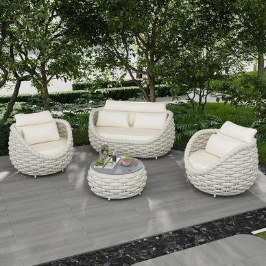 Inspired by bird's nest shape, the Erotr assembled cushioned sofa set for 4 person combines comfort, elegance and durability. Knitted-like ropes give a warm comfy looking. Curved scoop armrest, supportive backrest and deep cushioning offer an enveloping ultimate relaxation