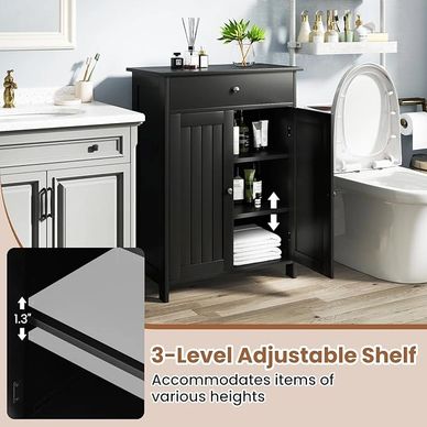 Measuring 23.5"L x 12"W x 31.5"H, the bathroom storage cabinet features a spacious tabletop, for storing frequently-used items like skincare products. It also includes a deep drawer and a 2-door cabinet with 3-tier adjustable storage shelf, neatly hiding personal items and toiletries from sight