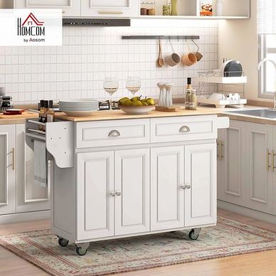 The rubberwood drop leaf countertop on this kitchen cart easily folds for space-saving or expands for additional dining spot or counter space with your bar stools, offering a water and scratch-resistant surface for your cooking needs