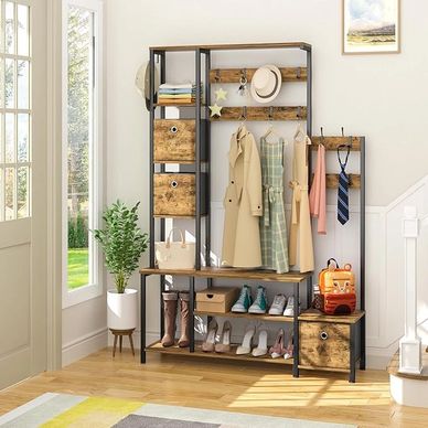 5-in-1 design combines coat rack, shoe bench, shoe rack, fabric drawers, storage shelf for entryway organization. You can sit on the entryway bench to change your shoes and then put hang your coat on the rack